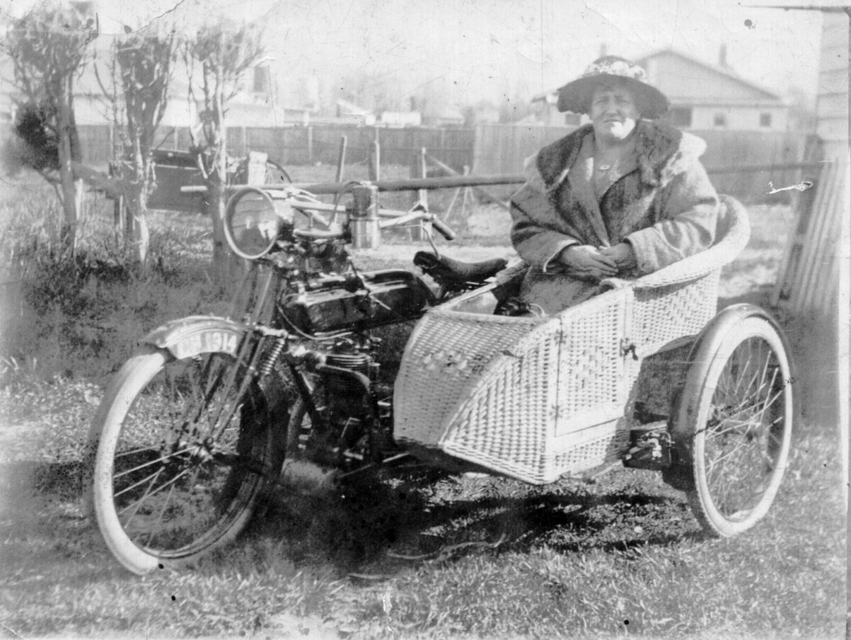 Auntie Edie about to head off on a Sunday Drive in a side car.