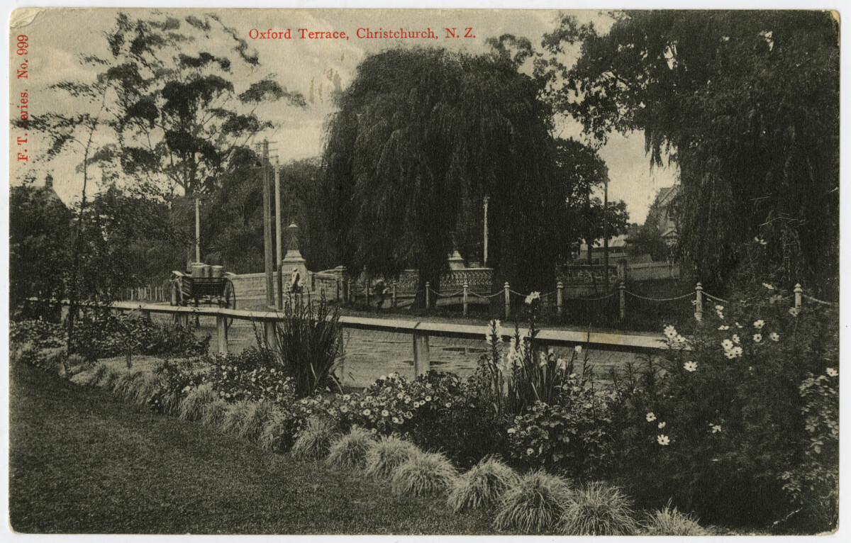 Black & white postcard of Oxford Terrace with unidentified bridge, horse and dray and roadside planting. On reverse: Addressee, message announcing a birth; red 1d. stamp. F. T. Series No. 999