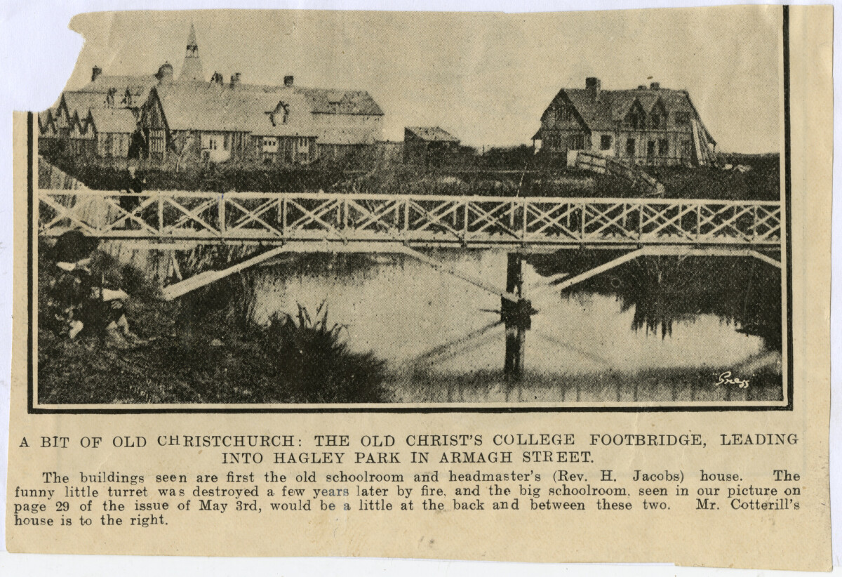 Newspaper photograph of footbridge from Christ's College into Hagley Park near Armagh Street entrance.