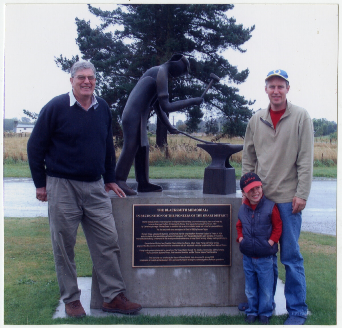 Left - Right: Duncan Taylor, 4th; Hamish Duncan Taylor, 55th; Duncan James Taylor, 6th. By the Blacksmith memorial plaque and sculpture erected in recognition of the pioneers of the Orari District. Duncan Taylor I was the first blacksmith in Orari.