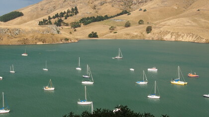 Boats moored in Purau Bay, Banks Peninsula.