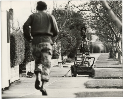 A bomb disposal expert with a robot at Derwent Street, Bryndwr ...