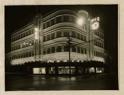 Office building 1939. Night view of new office building, ablaze ...