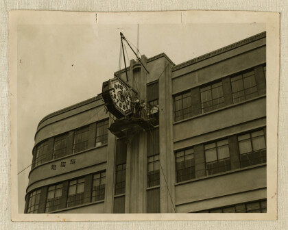 Clock into new position on new building, May 1939.