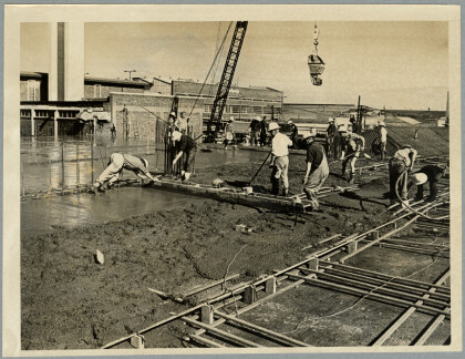 Two workers pouring cement from a mixing truck and smoothing the ...