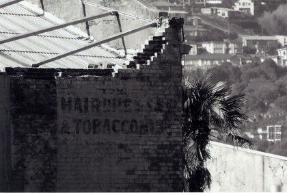 An old advertising sign for "Hairdresser & Tobacconist" on the ...