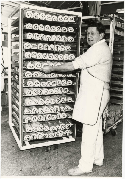 Jim Martin with a rack of sponge rolls at the factory of Ernest ...