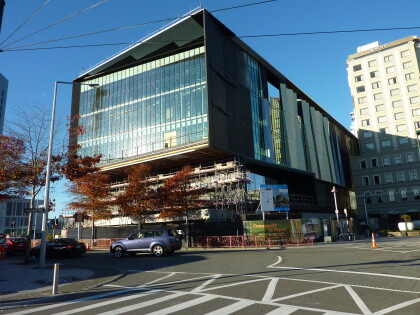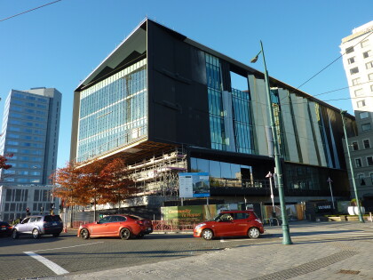 Photograph shows side of Tūranga, Christchurch Central Library, ...