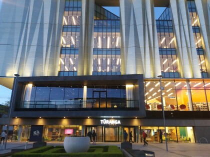 Entrance to Tūranga at dusk