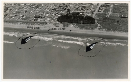 Aerial view of Waimairi Beach, showing rips.