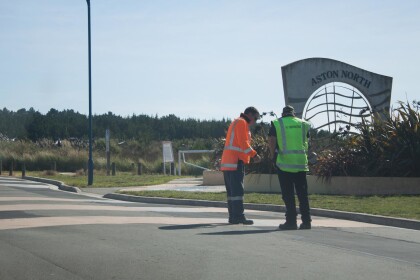 Contractors prepare for work, Aston Drive, Waimairi Beach