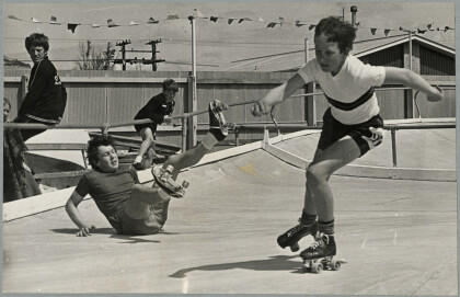 Gregory Atkinson falling near Grant Shortland at the Rollerdrome ...