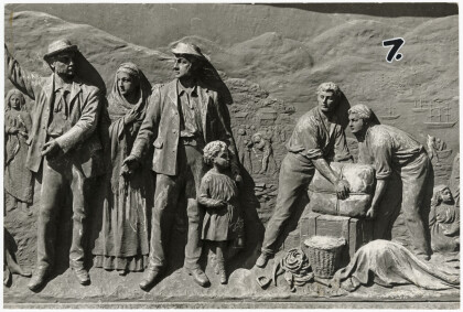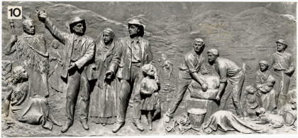 Bronze depiction of pilgrims landing at Lyttelton on the base of ...