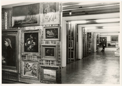 View of various artworks on sliding painting racks in one of the ...