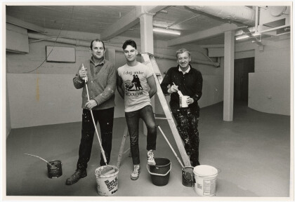 A group of construction workers standing in the basement area of ...