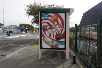 A bus stop with an Arnott's biscuits advertisement at 107 ...